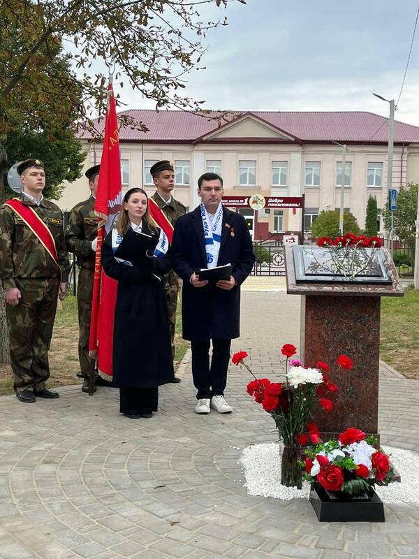 Воспитанники военно-патриотического клуба "Волот" приняли участие в торжественном открытии памятного знака. Торжественная церемония состоялась в знаковом для Жодино месте – у стен первой школы, рядом с краеведческим музеем. Это место, где история оживает в каждом камне, стало идеальным для увековечивания подвига педагогов. На мероприятии присутствовали представители власти и профсоюзных организаций: председатель Жодинского горисполкома Александр Цивако, председатель Белорусского профессионального союза работников образования и науки Татьяна Якубович, председатель Минской областной организации Профсоюза Татьяна Апранич. Этот знак – дань уважения и благодарности тем, кто, несмотря на тяготы войны, продолжал нести свет знаний и бороться за будущее. в честь педагогов-участников Великой Отечественной войны.