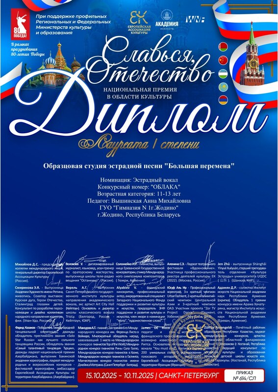 В период с 15.10.2025 по 10.11.2025 года в Санкт-Петербурге состоялся Международный онлайн конкурс-фестиваль "Славься, Отечество". Солисты образцовой студии эстрадной песни "Большая перемена" приняли участие и стали Лауреатом 1 степени.