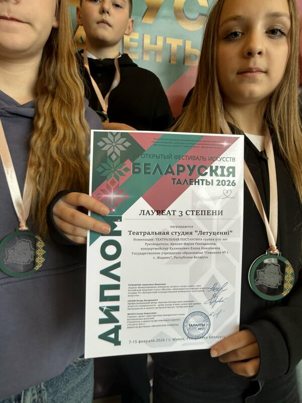 8 февраля 2026 года учащиеся 6 "А" класса, которые занимаются в гимназии в театральной студии "Летуценнi", принимали участие в XII Открытом фестивале искусств "БЕЛАРУСКiЯ ТАЛЕНТЫ-2026" (г.Минск) со спектаклем "Ребята с Петроградской". Жюри оценило выступление юных театралов дипломом лауреата III степени.